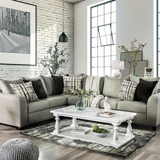 Furniture of AmericaJAYLENE Gray Sectional, 99"L X 66"W X 28"H, 178lbs. A handsome tuxedo style sectional set that will blend perfectly into any modern home with its m...